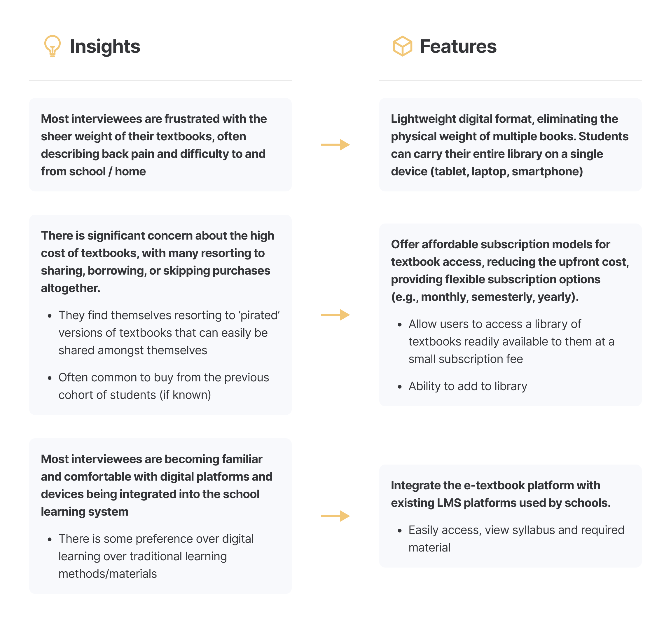 To validate my assumptions, I conducted research and user interviews with students of different levels of schooling (ages 18 - 24). More specifically, I wanted to learn their needs, motivations, and frustrations with their current methods of learning, and self-identify as textbook users.