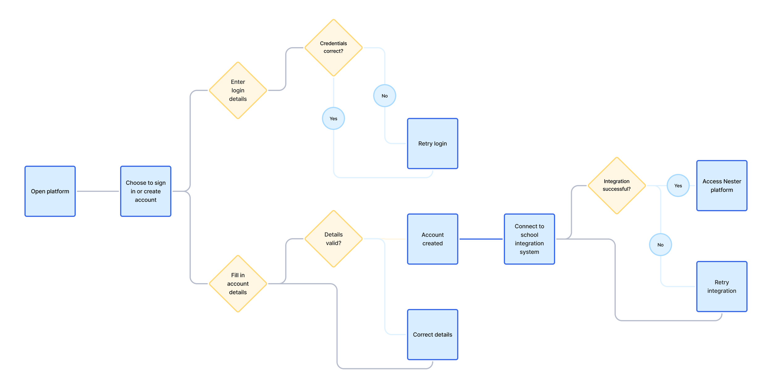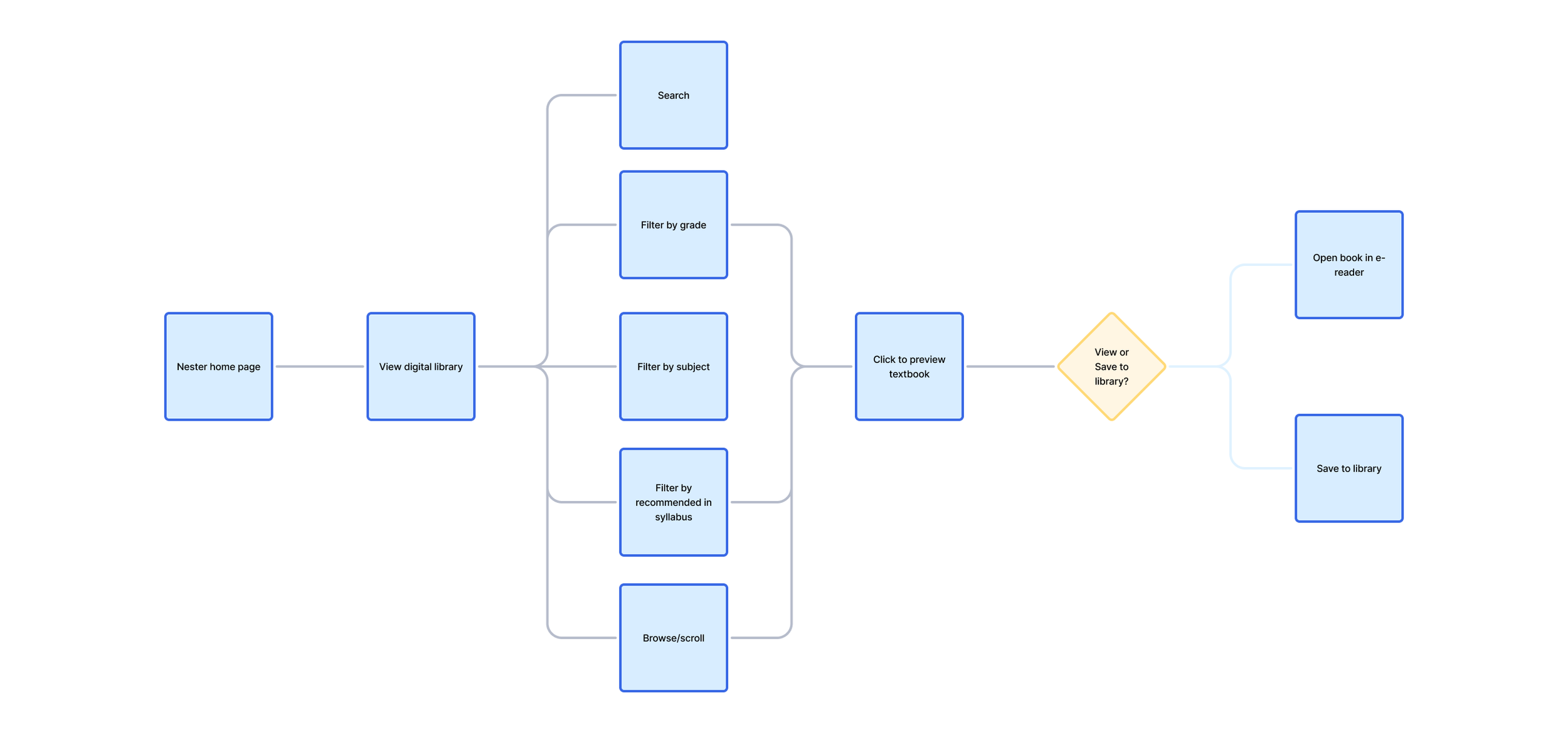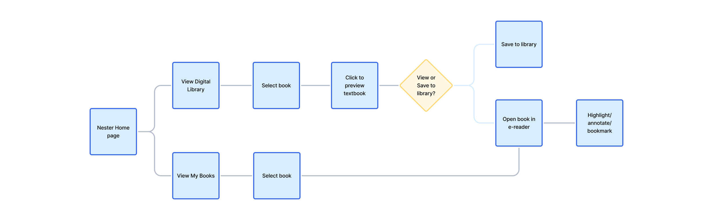 Once I was happy with the content organisation, I began thinking about how I wanted the user to interact with the platform to accomplish some important goals – create an account, add a textbook to the library, view the textbook and highlight the content. I included some decision points where a user may not want to pursue more information, or may want to skip a step.