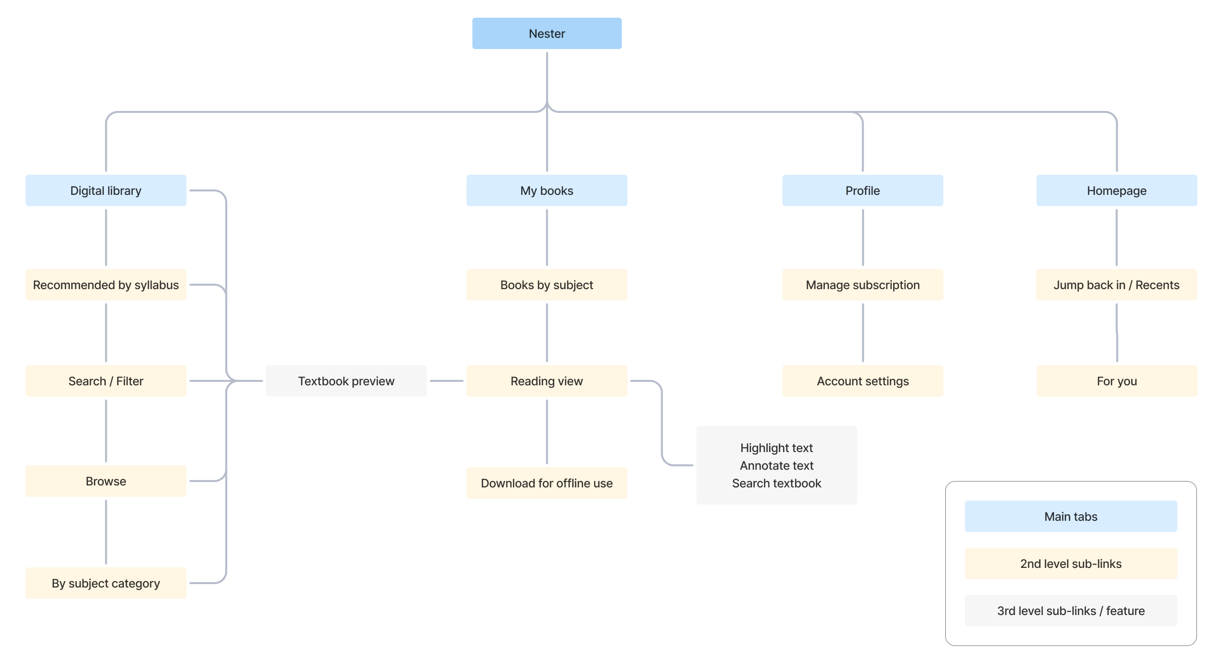 With features prioritised, I started piecing together the information architecture. I had initially envisioned a simple platform with just two sections: one for browsing a library of books, and one for the books that was saved/relevant to the user. I decided to join the textbook preview experience between the digital library and my books, so that when a book is previewed in the digital library, users can add it to My Books and jump straight into the reading view from there.