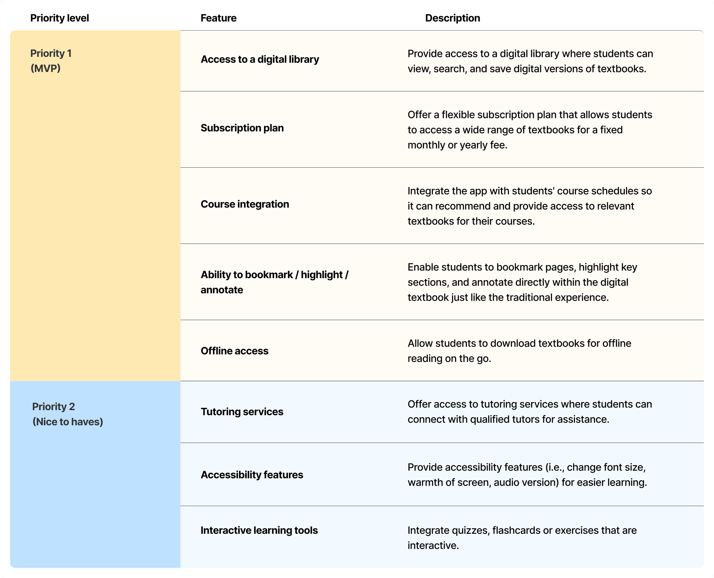 After I established the basic functionality to prioritise, I got excited and brainstormed features that I could explore in future designs. Below are list of features in order of priority. Due to the time constraints of this project, I addressed only the core features.